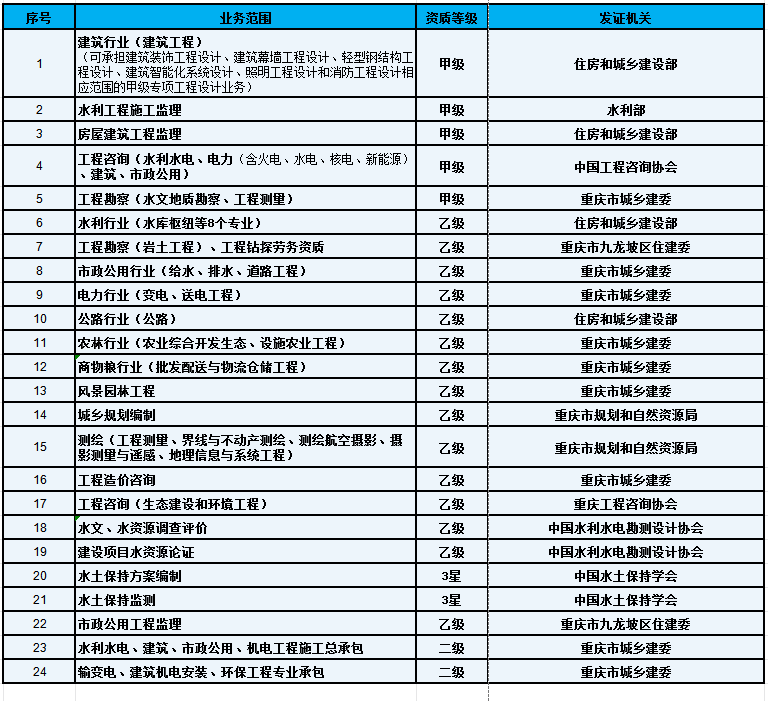 公司现具有建筑工程设计甲级,水利工程监理甲级,房屋建筑工程监理甲级,工程咨询专业甲级,工程勘察专业甲级,水利行业设计乙级,市政公用工程设计乙级,电力工程设计乙级,农业工程设计乙级,商物粮工程设计乙级,公路工程设计乙级,风景园林工程设计专项乙级,水资源论证乙级,水土保持方案编制3星级,水土保持监测3星级,水文水资源调查评价乙级,工程造价咨询企业乙级,城乡规划编制乙级,测绘乙级,市政公用工程监理乙级,工程钻探劳务资质,水利水电、建筑、市政公用、机电工程总承包二级,输变电、建筑机电安装、环保专业承包二级等49个专业资质(资信)证书。